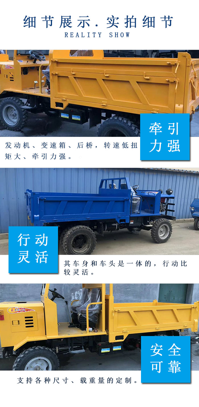 产品详情:用以采矿的四轮车也称之为四不像工程车(四不像翻斗车),也称作四不像农用车。它的躯体和前部集成在一起,并且愈发灵巧。它不像拖拉机那么愚蠢,并且由于四个从未前后驱动器,因此可以根据客户需要安装各种马力的柴油发动机,因此它十分强劲且用到十分便利。